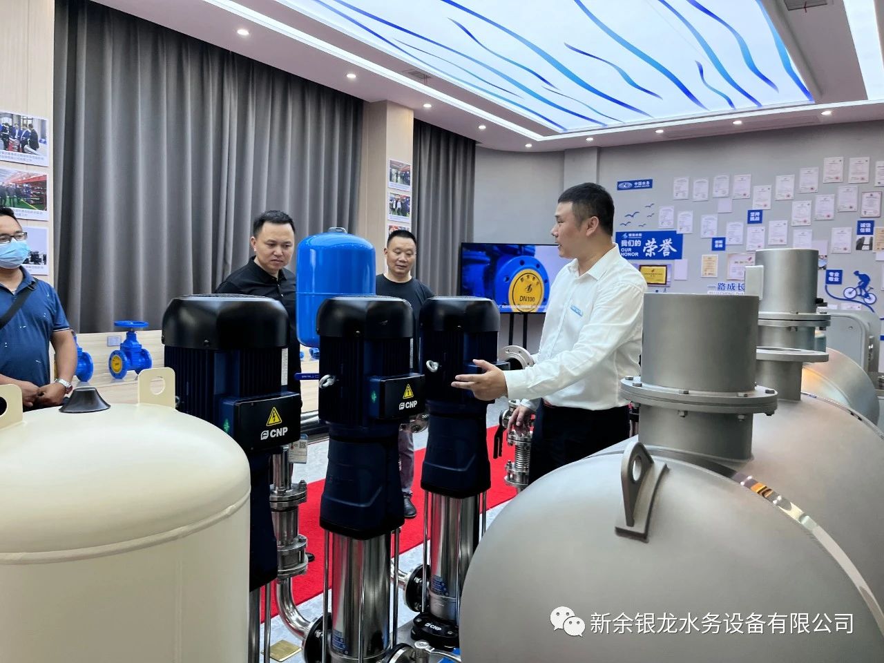 目前我司與懷化新晃已達(dá)成戰(zhàn)略合作,6月21日下午,新晃縣城市管理和綜合執(zhí)法局黨組書記、局長黃超及懷化銀龍水務(wù)有限公司總經(jīng)理姚曉明一行六人蒞臨我司實(shí)地考察,參觀交流并指導(dǎo)工作。黃局一行在我司總經(jīng)理陳科宇等公司領(lǐng)導(dǎo)的陪同下,先后參觀了公司機(jī)械生產(chǎn)車間、二次供水設(shè)備展廳、二次供水監(jiān)控管理平臺及新余市城北商務(wù)廣場標(biāo)準(zhǔn)化泵房示范單元。